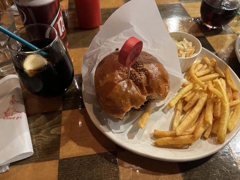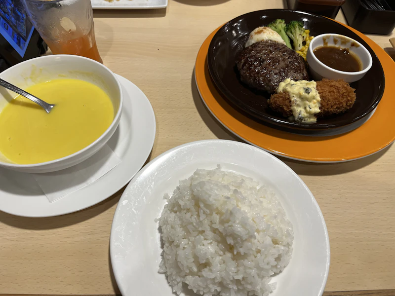 夜は近くのジョナサンでご飯を食べた。ヘルミッペさんがハンバーグを頼んだから真似した。
