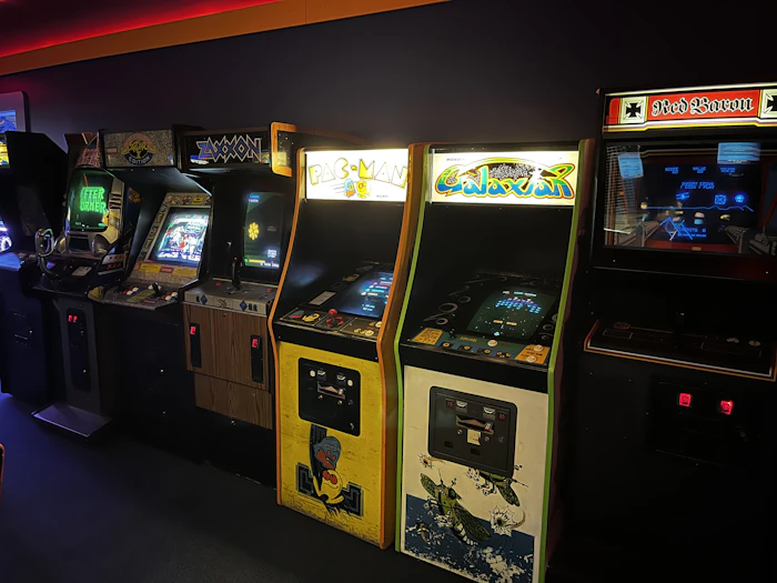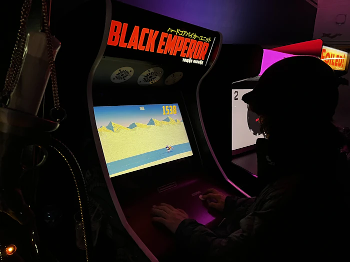 ゲーセンのようなアーケード筐体も実際に遊べる!このような空間で遊ぶと移植されたものをゲーム機の中で遊ぶのとは体験が違う。その空間でコインを入れて遊ぶからこそのゲームデザインになってるのかな〜とか考えてた。シューティングでもそういう話を聞いたことがある。ハードや環境に合わせてソフトも変わってきてるのかな、とか。